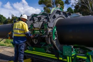 Vinidex provided support to the final pipeline design to minimise cost and provide optimum fluid flow. Even after the contract was signed, Vinidex worked with the TasWater’s Capital Delivery Office project team to accommodate changes to fitting requirements. The large pipe sizes and pressure requirements for the pipeline necessitated large wall thicknesses. To achieve even wall thickness around the circumference of the pipe, a unique low slump resin was specially sourced for the project. The 3km of large bore pipe was manufactured at Vinidex’s world class extrusion facility in Toowoomba, QLD. This required careful logistic planning to safely load and restrain the pipe for delivery to Tasmania. Vinidex also provided specific pre-slinging of the pipes requested by the welding contractor to assist in unloading the pipe. Transporting the pipe down Australia’s east coast and across the Bass Straight required coordination of two transportation companies utilising the same trailer to minimise handling of the pipe. Deliveries were also closely coordinated with TasWater to to meet a tight delivery schedule. Vinidex produced one of the largest wall thickness pipes ever made by the Australian manufacturer, with the DN900 SDR9 pipe having a minimum wall thickness of 100mm while the DN1000 SDR11 has a minimum wall thickness of 90.2mm. The consistent wall thickness provided by the low slump resin facilitated the welding of pipe and provided for a seamless installation.