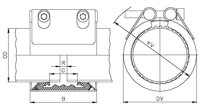 | Vinidex Code - EPDM | Vinidex Code - NBR | Pipe OD (mm) | Clamping Range (mm) | PS Bar | B (mm) | C (mm) | DV (mm) | KV (mm) | Pipe Gap with Strip Insert (mm) | Torque rate (Nm) | Allen Head (mm) |