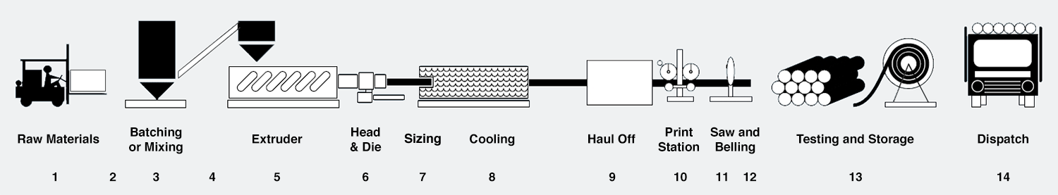 The PVC dryblend is metered into the barrel and screws, which then convert the dry blend into the required “melt” state, by heat, pressure and shear. During its passage along the screws, the PVC passes through a number of zones that compress, homogenise and vent the melt stream. The final zone increases the pressure to extrude the melt through the head and die set (6) which is shaped according to the size of the pipe required and flow characteristics of the melt stream. Once the pipe leaves the extrusion die, it is sized by passing through a precision sizing sleeve with external vacuum. This is sufficient to harden the exterior layer of PVC and hold the pipe diameter during final cooling in a controlled water cooling chambers (8).