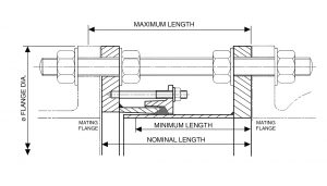 | Vinidex Code - EPDM A4 Fasteners | Nominal DN (mm) | Drilling Table | Mating Flange (mm) | Flange Thickness (mm) | Flange OD (mm) | Flange to Flange Details - Nominal Length | Flange to Flange Details - Minimum Length | Flange to Flange Details - Maximum Length | Stainless Steel Tie Rod - Diameter x Thickness (mm) | No. | Total Weight (kg) |