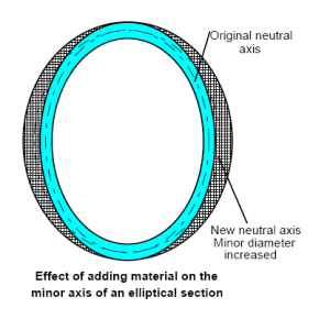 The ribs are not placed at this point however, but at the sides, with maximum thickness at the centre. Their effect is to move the neutral axis of the section outwards at the sides, resulting effectively in a more circular cross-section, and thus reducing the rounding bending moments.